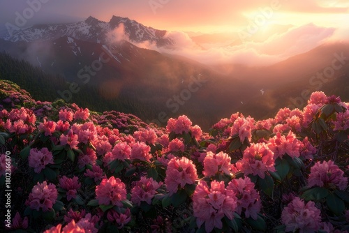 © nsit0108, Fototapeta premium Pink rhododendrons blooming on a mountainside during a breathtaking sunset