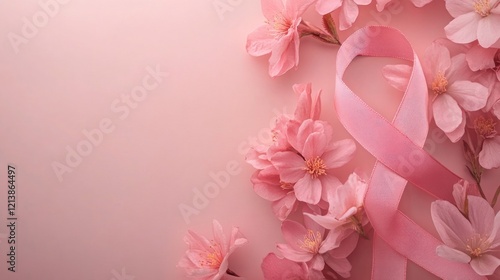 Naklejka premium Pink ribbon, cherry blossoms, pastel background, awareness campaign