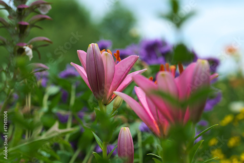 Fototapeta premium pink rosa leuchtende Lilien im Blumenbeet