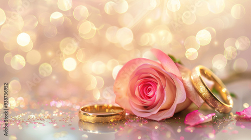 Fototapeta premium Pink Rose and Gold Rings with Glitter and Bokeh Background
