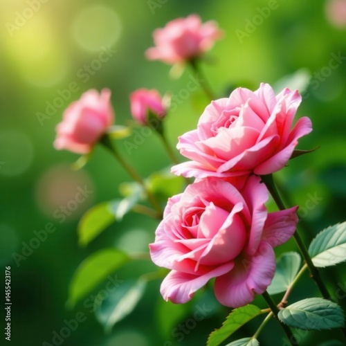 Obraz premium Pink rose blossoms against blurred green foliage, soft focus, green