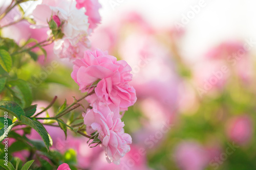 © fotofabrika, Fototapeta premium pink rose bush closeup on field background