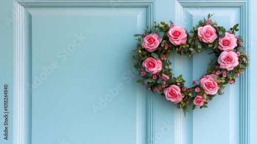 Fototapeta premium Pink Rose Wreath Adorning a Light Blue Door