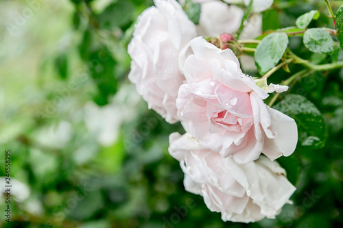 © lisinama, Obraz premium pink roses blooming in a garden with dew drops on it after rain