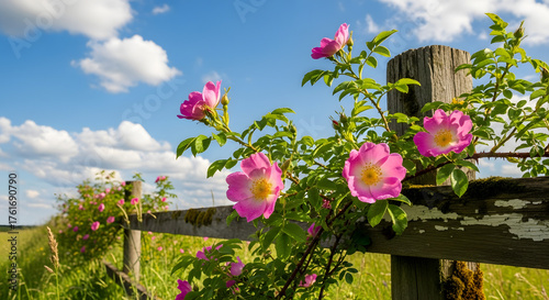 © Robert, Fototapeta premium Pink Roses Blossoming Along a Rustic Wooden Fence Under a Summer Sky