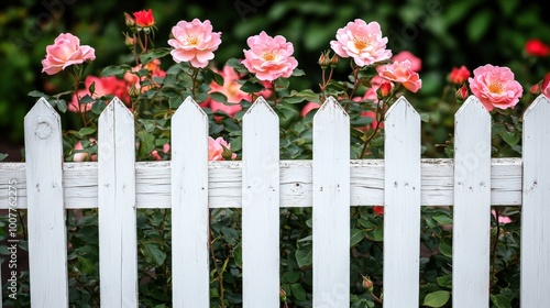 Fototapeta premium Pink Roses by White Wooden Fence in Garden