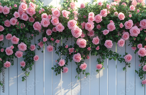 Fototapeta premium Pink roses climbing on a white wooden trellis, pink and green color palette, pink flowers in the background, detailed photorealistic image of flowers, pink roses growing on a wh