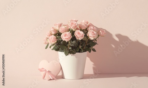 Fototapeta premium Pink roses in a white vase with a heart-shaped gift box on a colored background