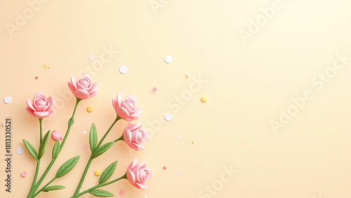 © Hasriani, Naklejka premium Pink roses with green stems and leaves are arranged on a light peach colored background with confetti, providing a soft and delicate aesthetic.