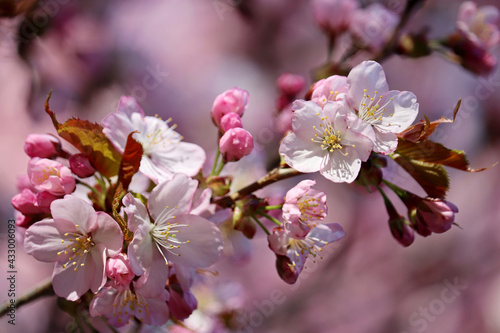 © Oleg, Obraz premium Pink sakura flowers on a branch close up. Cherry blossom in spring garden on blue sky background