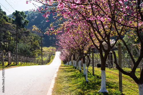 Fototapeta premium Pink sakura with beautiful road Doi Ang Khang, Chiang Mai , Thai