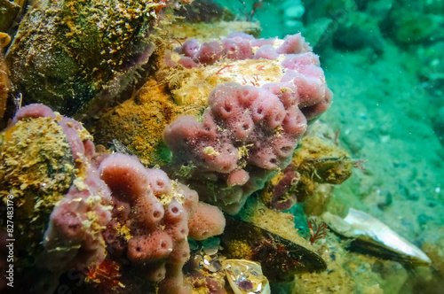 Naklejka premium Pink sea sponges Halichondria (Spongia) on the reefs in the Black Sea