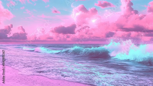 © Azahrul, Fototapeta premium Pink Sky, Blue Waves, and a Beach Sunset