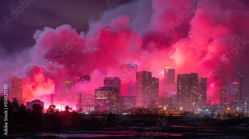 © Ferman Bagus Istuhri, Obraz premium Pink smoke engulfs city skyline at night