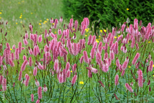Naklejka premium Pink spikes of Sanguisorba ‘Blackthorn’, also known as burnet, in flower.