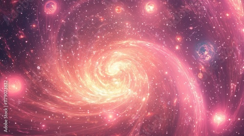 © Umi Sakina, Fototapeta premium Pink spiral galaxy with planets and stars.