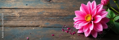 © Phetthanousack, Obraz premium Pink splatter dahlia on a rustic wooden table, flowers, flower stem