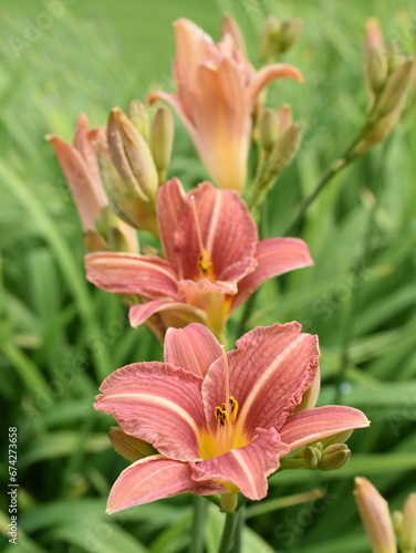 © hhelene, Fototapeta premium Pink striped lilies flowering in a garden