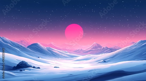© addymawy, Obraz premium Pink Sun Over a Snow-Covered Mountain Range