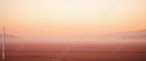 Fototapeta premium Pink sunrise illuminating foggy desert landscape with mountains