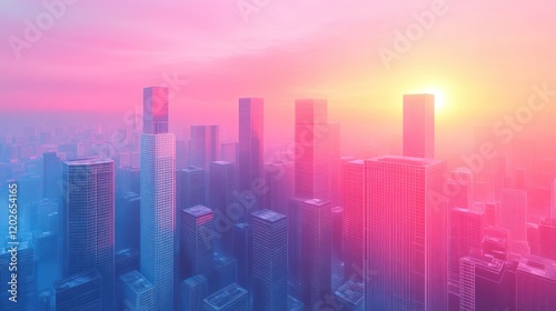 © MABRUR, Fototapeta premium Pink sunrise over hazy city skyline, aerial view