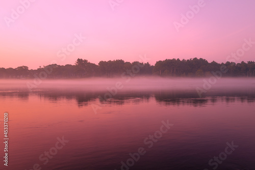© Naya Na, Fototapeta premium Pink sunrise over the Cape Cod Canal. Symmetrical reflections of the sky and forest over the water surface.