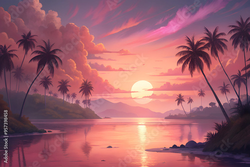 © anastasia_7em, Fototapeta premium pink sunset on the palm beach illustration