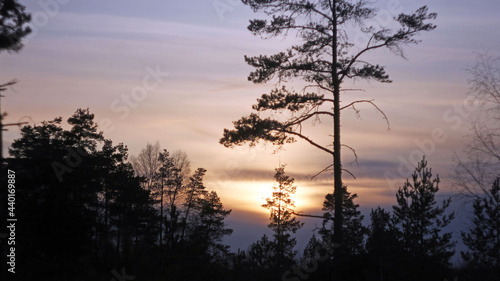 Fototapeta premium Pink sunset over a pine forest, sunset in the clouds, wildlife