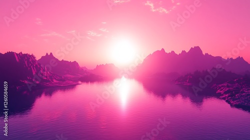 Fototapeta premium Pink Sunset over Calm Lake Silhouetted Mountains Reflecting Soft Light. AI...