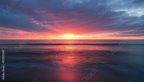 © Murda, Obraz premium Pink sunset over calm ocean waves.