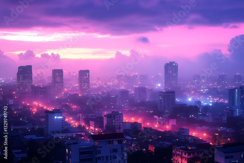 © Ardhana, Obraz premium Pink sunset over hazy city skyline.