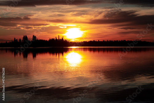 © Amy, Naklejka premium Pink sunset over lake with black silhouette tree line