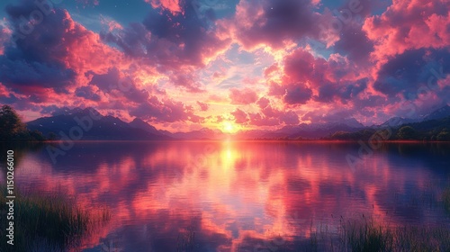 © Ali, Fototapeta premium Pink sunset reflects on calm lake, mountains.
