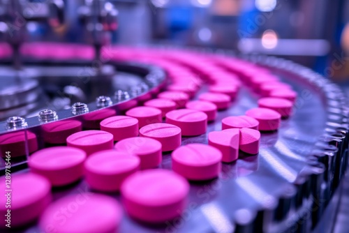 © Odin AI, Obraz premium Pink tablets move along a conveyor belt in a pharmaceutical manufacturing facility during daytime operations