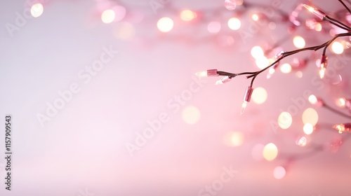 © inspiretta, Fototapeta premium Pink tree branch with lights on it. The lights are on the branches and the background is pink