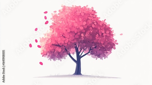 © Zeva, Obraz premium Pink tree, leaves falling, white background, spring illustration