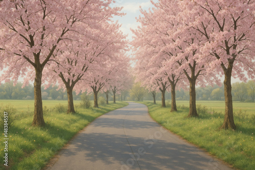 © Midea , Naklejka premium Pink trees lining a road in a vibrant painting.