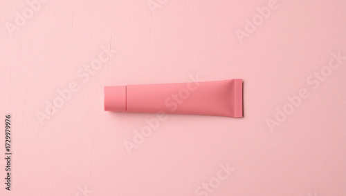© Anuyj, Fototapeta premium Pink tube of cosmetic product on a pink background with foliage.
