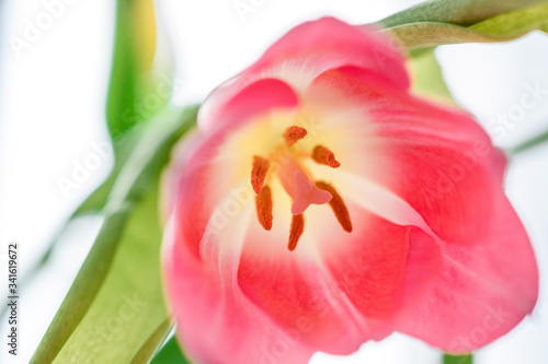 Fototapeta premium Pink tulip close-up on a white background.