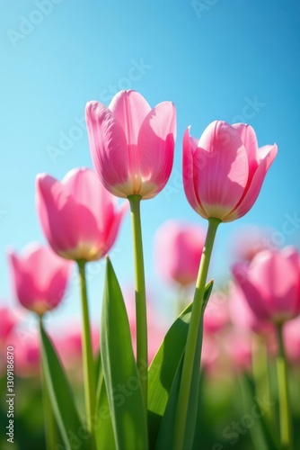 © Yuwadee, Fototapeta premium Pink tulip cluster, clear azure sky, bright spring scene, web, design, vibrant