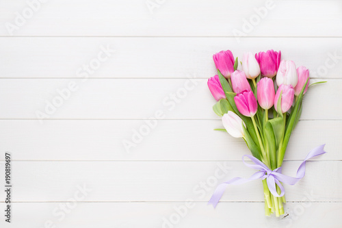 © gitusik, Fototapeta premium Pink tulip on the white background. Easter background