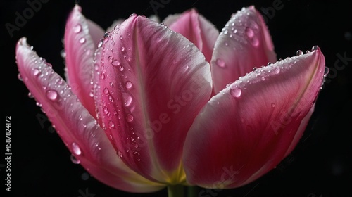 Fototapeta premium Pink Tulip with Dew Drops on Petals Against Dark Background
