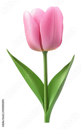 © Oksi, Fototapeta premium Pink tulip with green leaves against a transparent background, realistic illustration