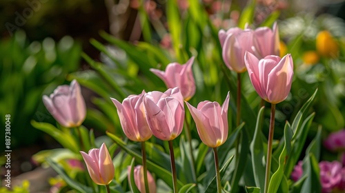 © Generative AI, Fototapeta premium Pink tulips blooming in a spring garden : Generative AI