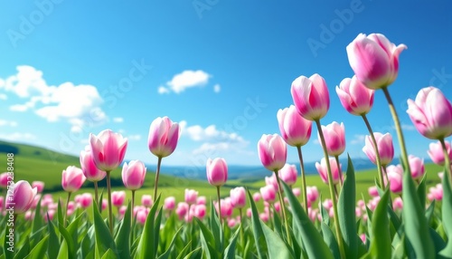© ekalaila, Obraz premium Pink tulips blooming in a sunny field