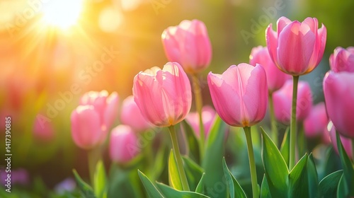 © Scoop, Fototapeta premium Pink Tulips Blooming in the Sunset Light