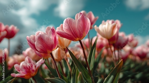 © underground, Fototapeta premium Pink tulips blooming under a blue sky in a field, spring floral background