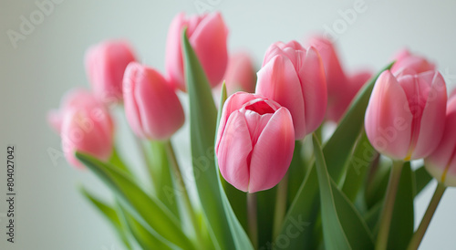 © NeuroCake, Fototapeta premium Pink tulips bouquet, on white background. Сlose-up for greeting cards and Mother's Day event. Banner with copy space.