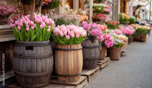 © abraham, Fototapeta premium Pink tulips in rustic wooden barrels outside a charming flower shop.
