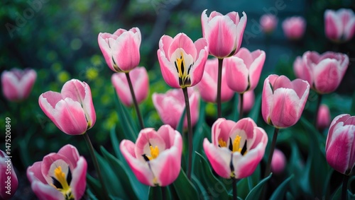 © NeuralNiche, Obraz premium Pink tulips in soft focus within a garden, set against a natural background
